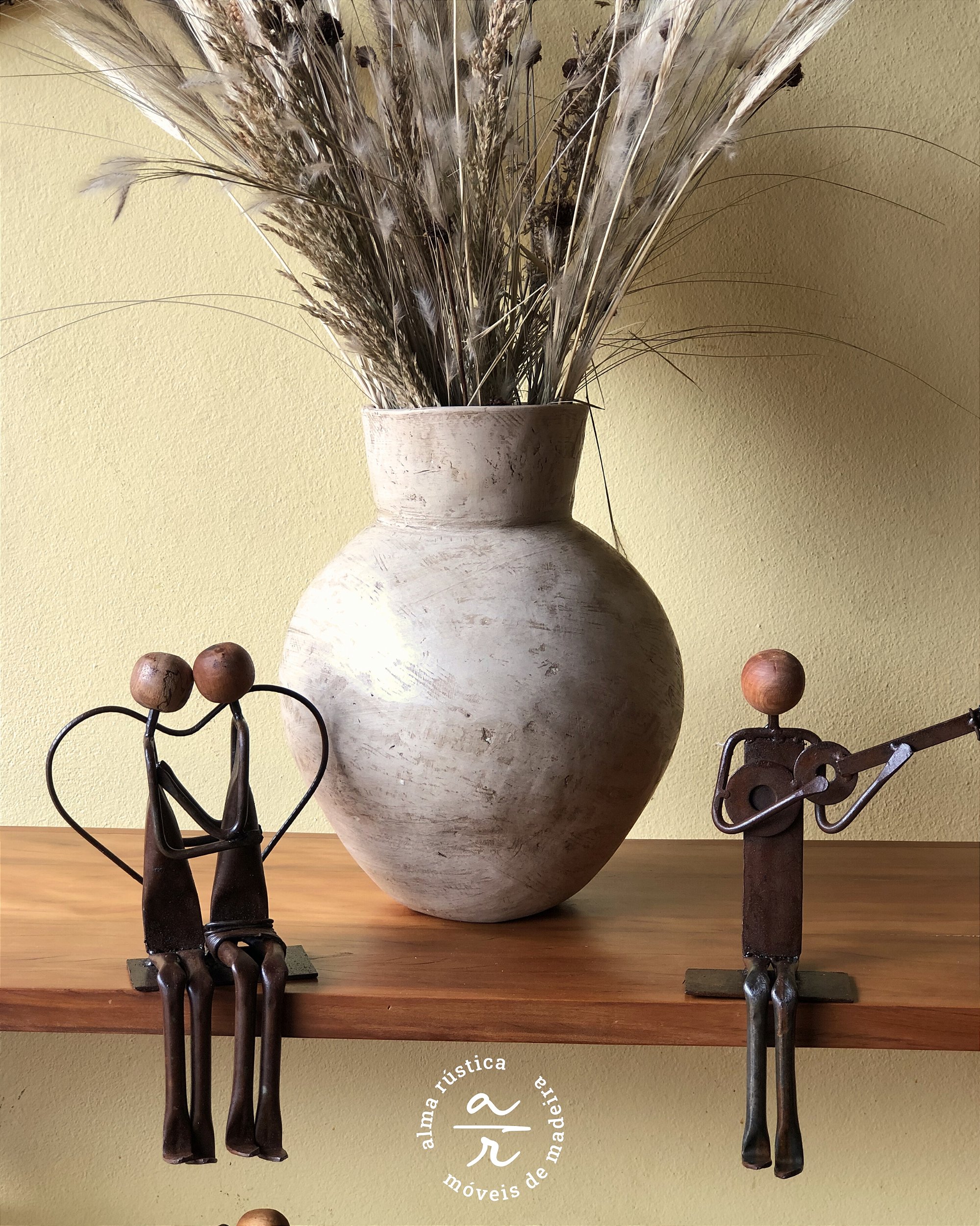 Os detalhes em madeira natural aplicados nas cabeças criam um contraste harmonioso com a ferragem, trazendo equilíbrio visual e reforçando a identidade artesanal das peças. Uma das esculturas retrata um casal em um gesto de carinho, simbolizando união e cumplicidade, enquanto a outra representa uma figura com instrumento musical, evocando arte, sensibilidade e expressão cultural.