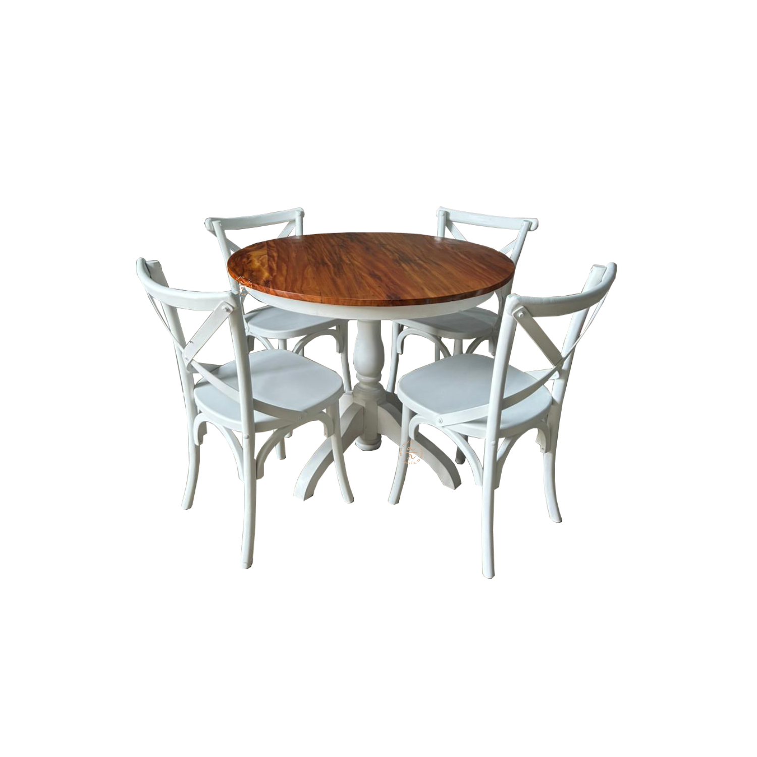 A base da mesa é produzida em madeira maciça e recebe acabamento com pintura automotiva na cor branca, que proporciona maior resistência ao desgaste, uniformidade visual e proteção da superfície. Seu formato central garante estabilidade e melhor aproveitamento do espaço.